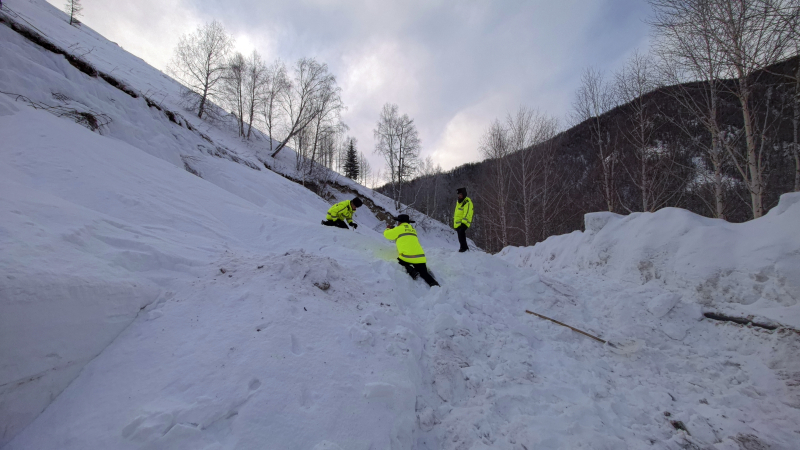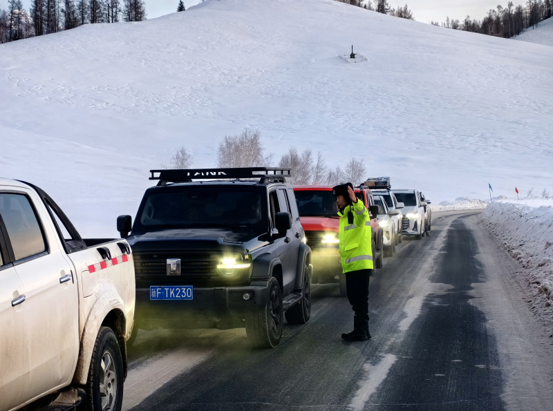 当车队行驶到禾木道路X852线约16公里处时,图孟巴雅尔的对讲机里传来禾木交警中队中队长叶尔生别克·阿依登的呼叫声:“带道警车注意,带道警车注意,探路车在X852线25公里处发现推山雪,车辆无法通行,立即在低风险路段停车等待。”