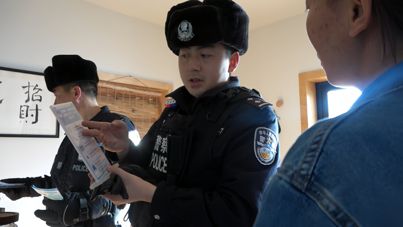 新疆出入境边防检查总站阿勒泰边境管理支队禾木边境派出所民警王卫州(中)为民宿经营者普法。石榴云/新疆法治报记者 郑旭磊摄