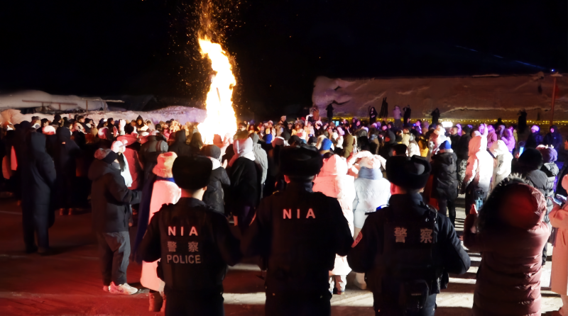 2月7日,新疆出入境边防检查总站阿勒泰边境管理支队禾木边境派出所民警在禾木景区篝火晚会现场执勤。石榴云/新疆法治报记者 郑旭磊摄