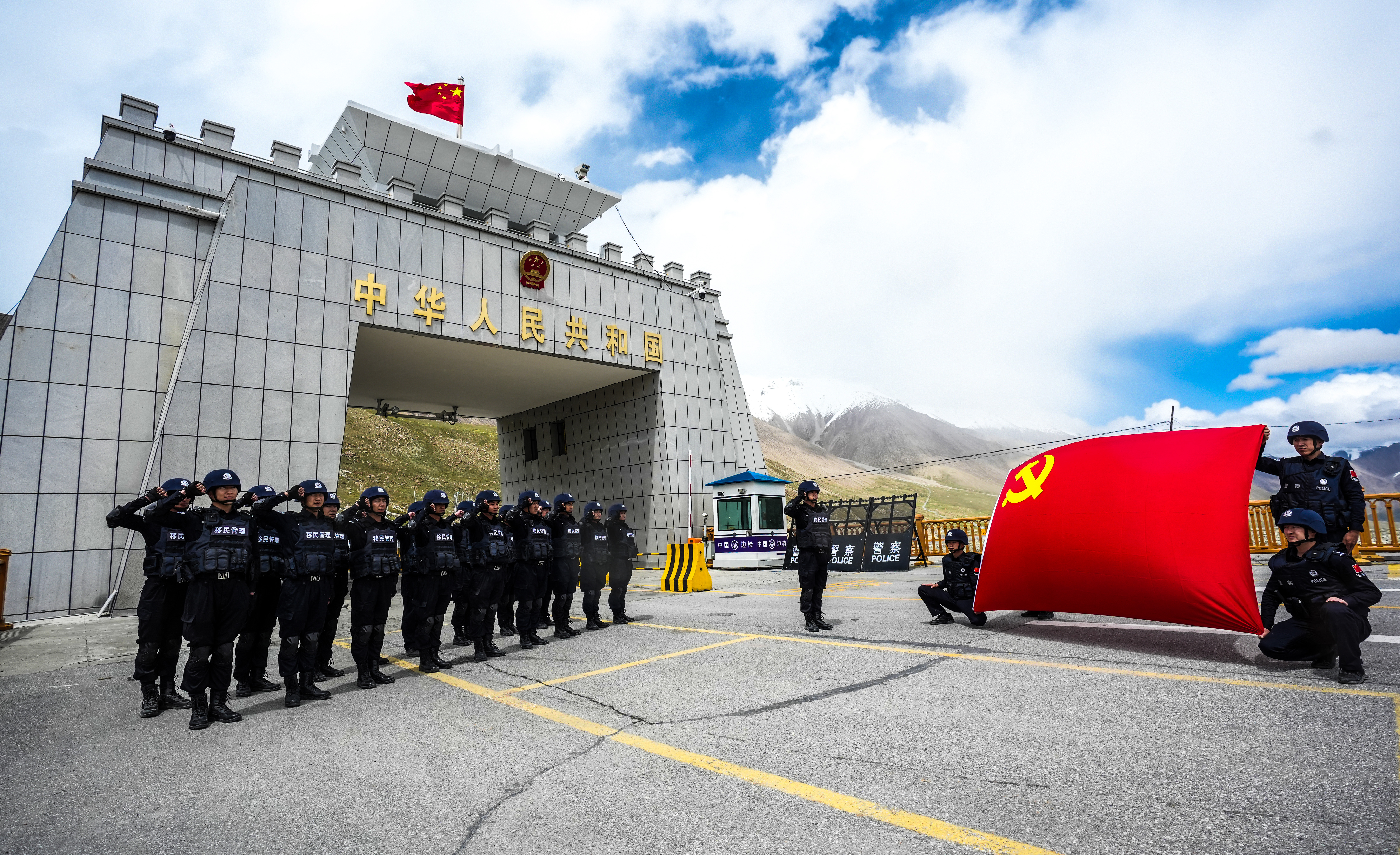 新疆出入境边防检查总站红其拉甫出入境边防检查站民警在海拔5100米的红其拉甫国门前重温入党誓词。受访单位供图