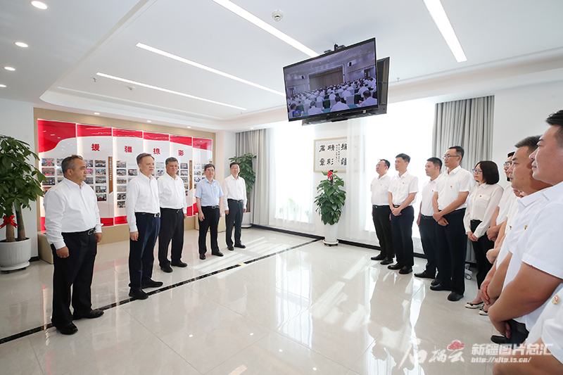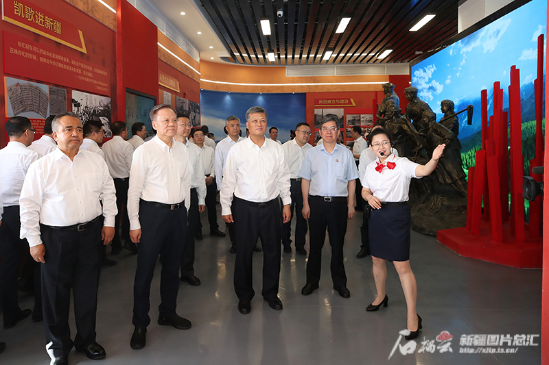 7月8日,天津市委书记陈敏尔,自治区党委书记、兵团党委第一书记、第一政委马兴瑞,自治区党委副书记、自治区主席艾尔肯·吐尼亚孜等参观新疆军垦之星展览馆,了解兵团发展历程和智力支援、产业合作进展情况。天山网-新疆日报记者 崔志坚摄