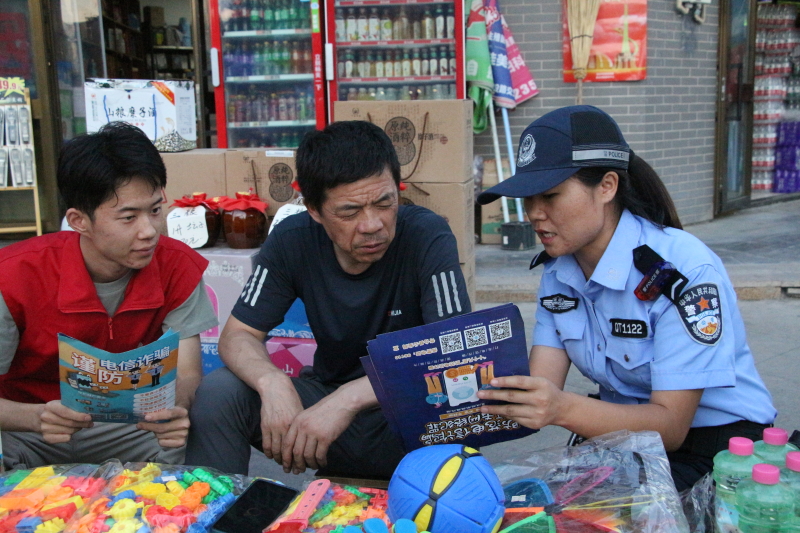 奇台县公安局东门派出所辅警带领靖宁义警队员向辖区商户进行普法宣传。石榴云/新疆法治报记者 韩晋摄