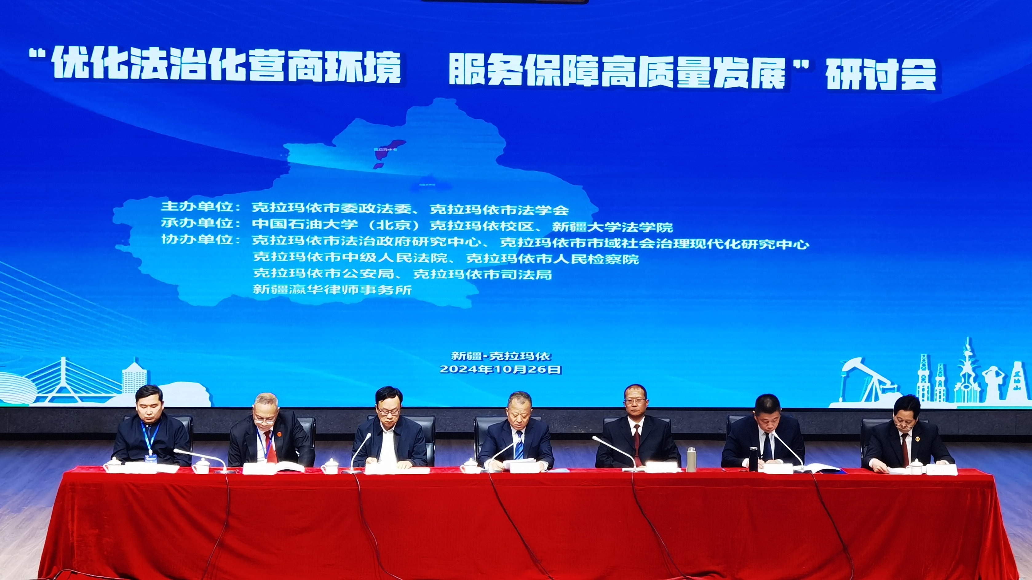 石榴云/新疆法治报讯(记者 郭玉强报道)10月26日,由克拉玛依市委政法委、克拉玛依市法学会主办,中国石油大学(北京)克拉玛依校区、新疆大学法学院承办的“优化法治化营商环境 服务保障高质量发展”研讨会在克拉玛依举行,自治区党委政法委副书记黄荣军,克拉玛依市委副书记、政法委书记、市法学会会长王冰出席并讲话。