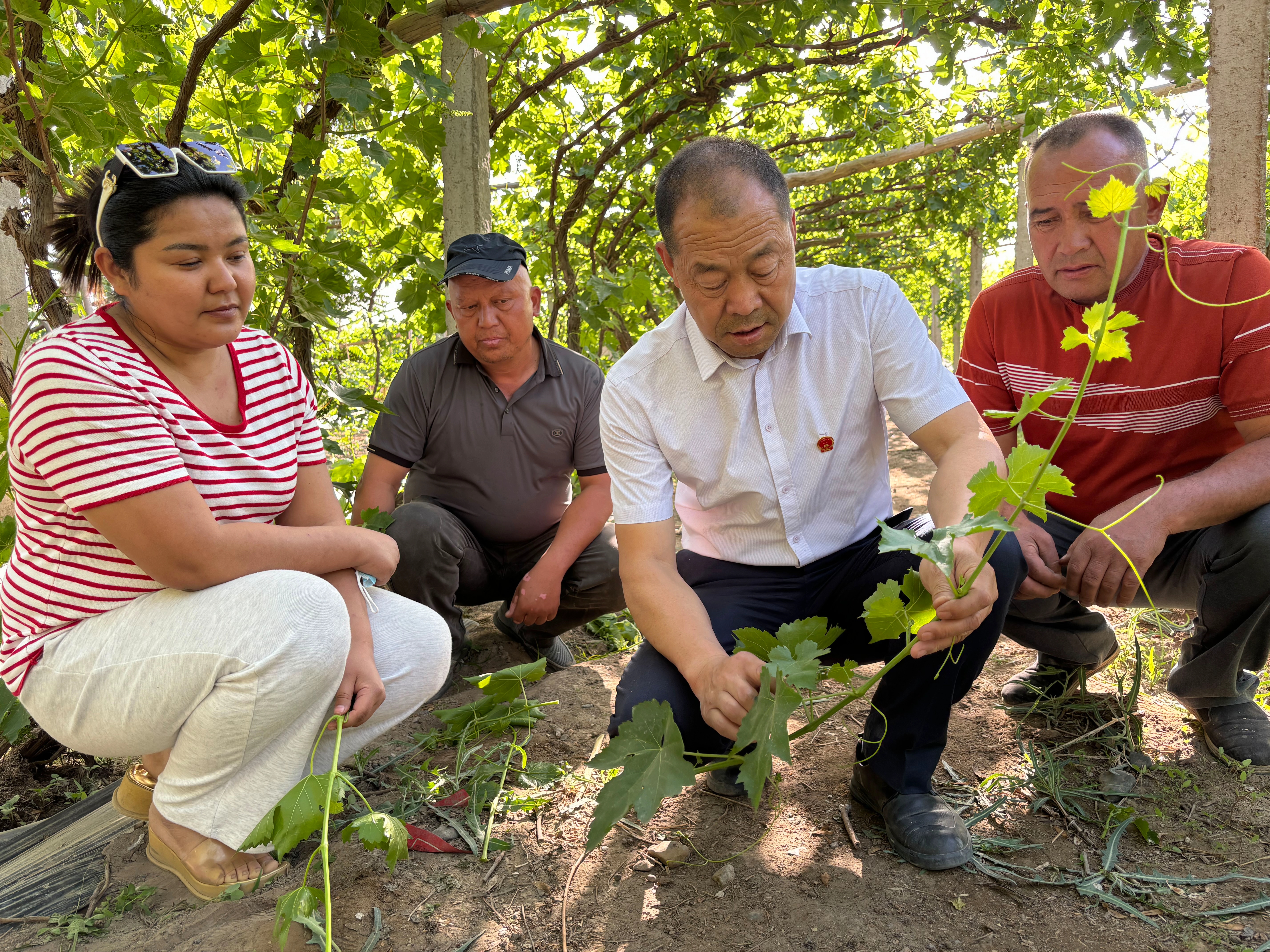 5月9日,许世银(中)在葡萄架下和农户研究种植问题。受访单位供图