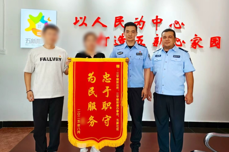 8月24日,居民王某将一面锦旗送到五新社区警务室。通讯员 张晴摄