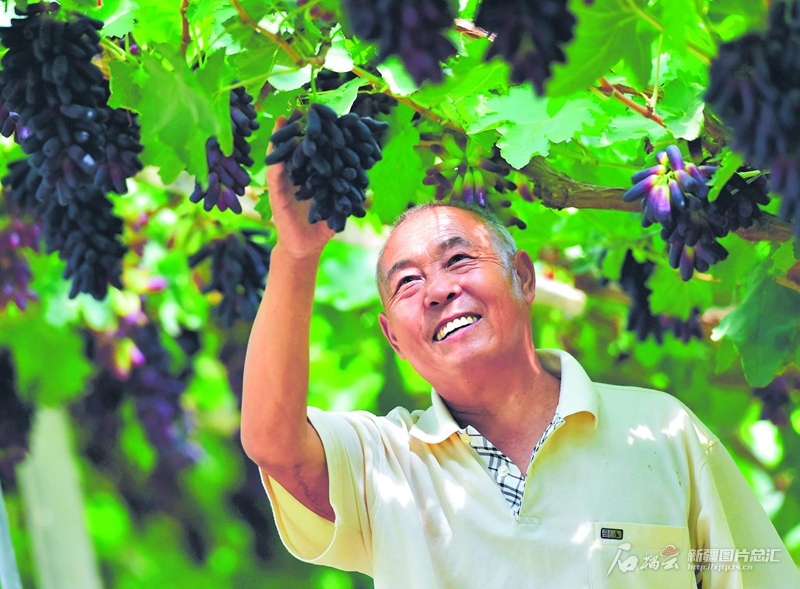 7月5日,库尔勒市西尼尔镇种植户在葡萄园里查看葡萄长势。近年来,该市积极引导农民种植葡萄、香梨等特色林果,促进农业增效、农民增收。天山网-新疆日报记者王立华摄