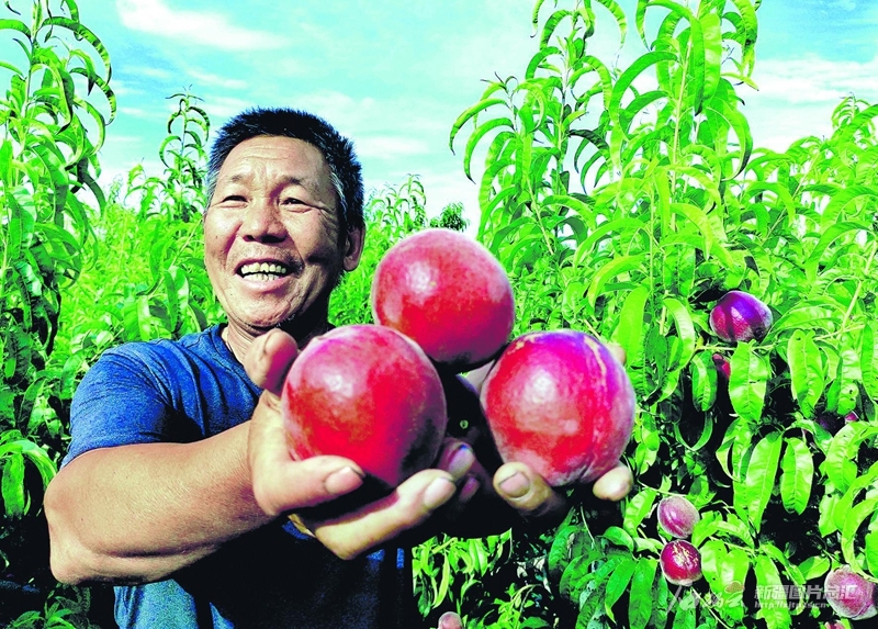 7月7日,奇台县古城乡果园村村民在展示成熟的桃子,脸上满是丰收的喜悦。□安涛摄