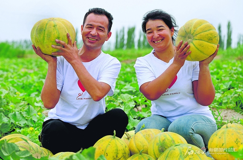 7月9日,轮台县轮台镇拉帕村村民在瓜田里展示成熟的“老汉瓜”。目前,该村2000余亩“老汉瓜”陆续成熟,村民加紧采摘上市销售。 □李新芳摄