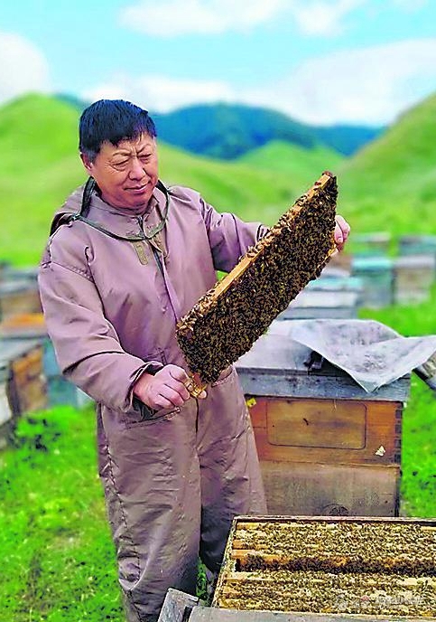 7月10日,蜂农在察布查尔锡伯自治县琼博拉镇克其克博拉村一处山坡查看蜜蜂的产蜜情况。盛夏时节,这里山花烂漫,吸引众多养蜂人追花逐蜜,酿造甜蜜生活。华岩明摄