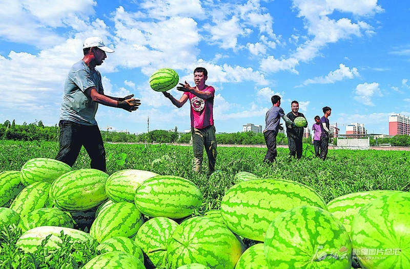 7月5日,呼图壁县园户村镇和庄村瓜农在搬运西瓜。眼下,该县种植的大田西瓜陆续成熟,瓜农抢抓农时加紧采收、装车,田间一派繁忙的丰收景象。陶维明摄
