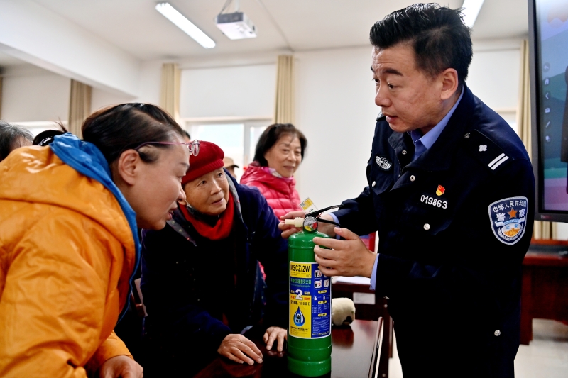 3月16日,民警为居民讲解灭火器的正确使用方法。石榴云/新疆法治报记者 单坤摄