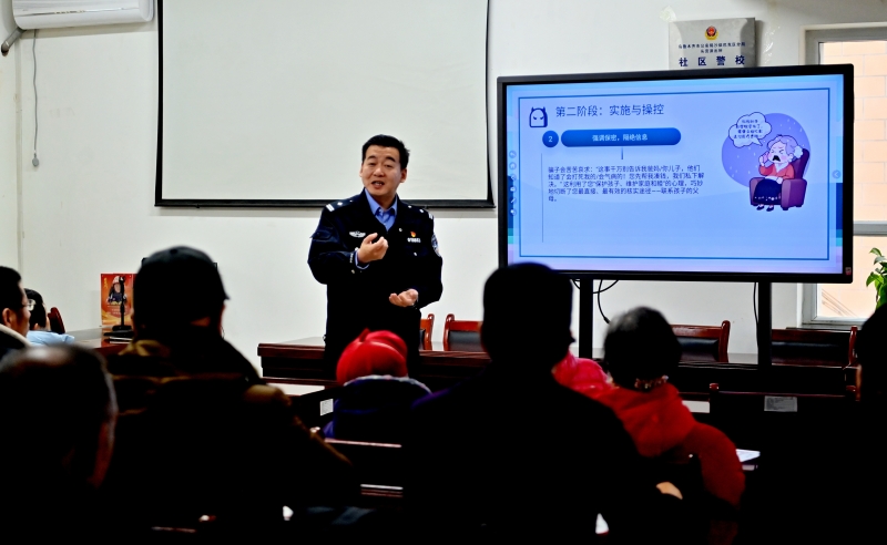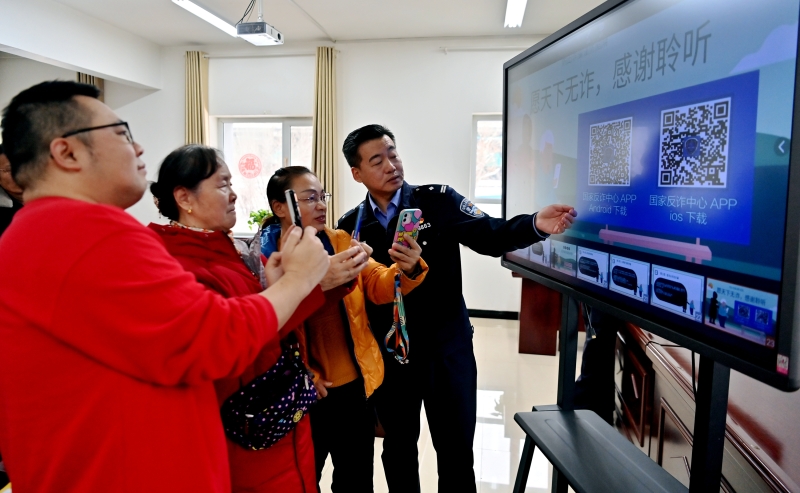 3月16日,民警为居民讲解各类防范电信网络诈骗的方法。石榴云/新疆法治报记者 单坤摄