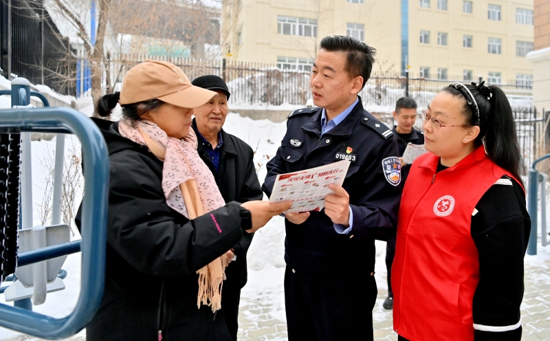 3月16日,民警和社区工作人员为居民讲解如何防范电信网络诈骗。石榴云/新疆法治报记者 单坤摄