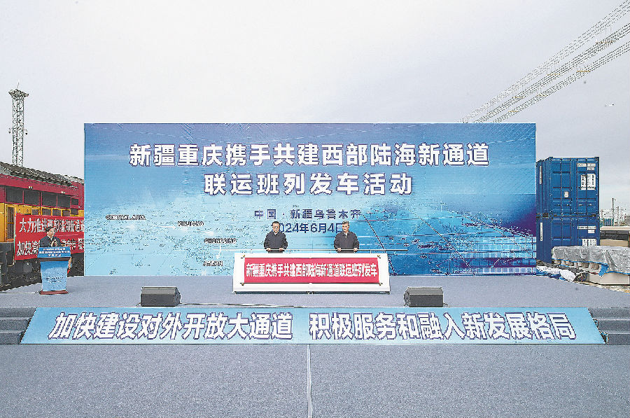 6月2日至4日,重庆市代表团来新疆考察交流。这是6月4日,重庆市委书记袁家军,自治区党委书记、兵团党委第一书记、第一政委马兴瑞共同为新疆重庆携手共建西部陆海新通道联运班列启动发车。