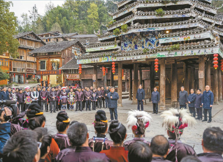 3月17日至18日,中共中央总书记、国家主席、中央军委主席习近平在贵州考察。这是17日下午,习近平在黔东南州黎平县肇兴侗寨考察时,同村民们亲切交流。 新华社记者 翟健岚 摄