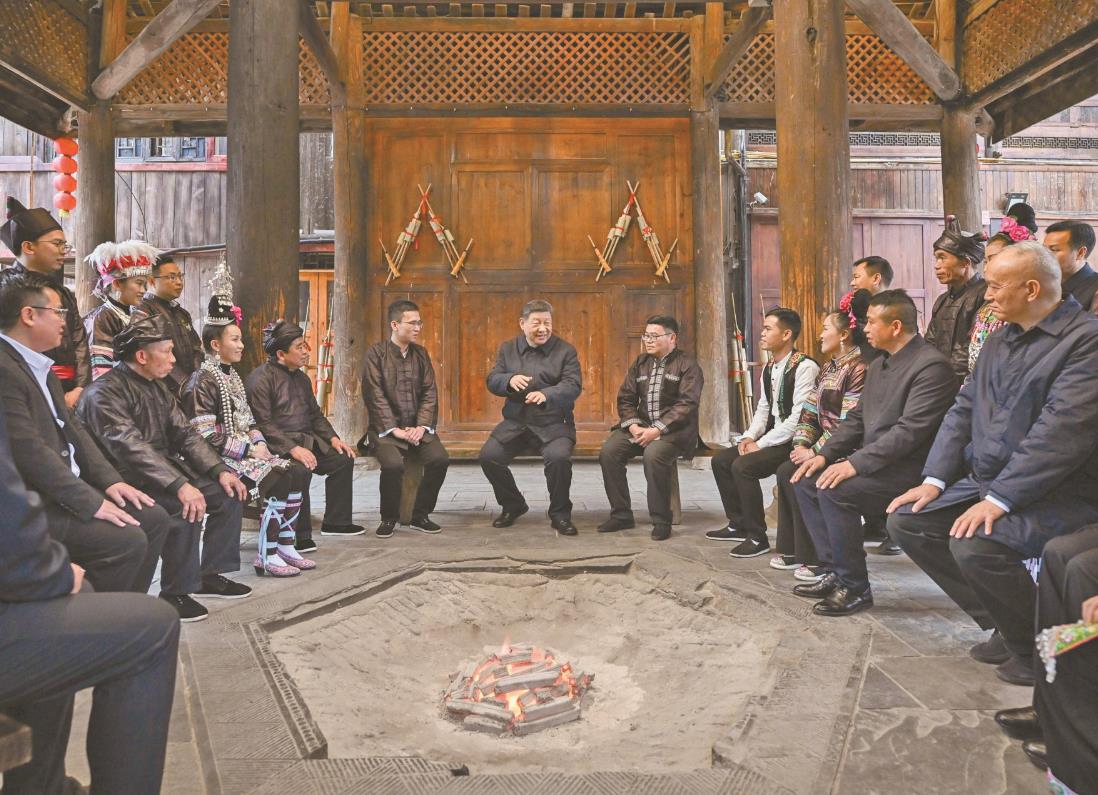 3月17日至18日,中共中央总书记、国家主席、中央军委主席习近平在贵州考察。这是17日下午,习近平在黔东南州黎平县肇兴侗寨考察时,在信团鼓楼同村干部和村民代表围坐在火塘边,共话乡村全面振兴。 新华社记者 谢环驰 摄