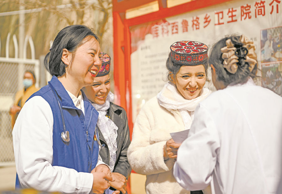 在新疆塔什库尔干塔吉克自治县库科西鲁格乡卫生院,深圳援疆新生儿科医生潘千(左一)与村民、乡卫生院医护人员交流(3月24日摄)。