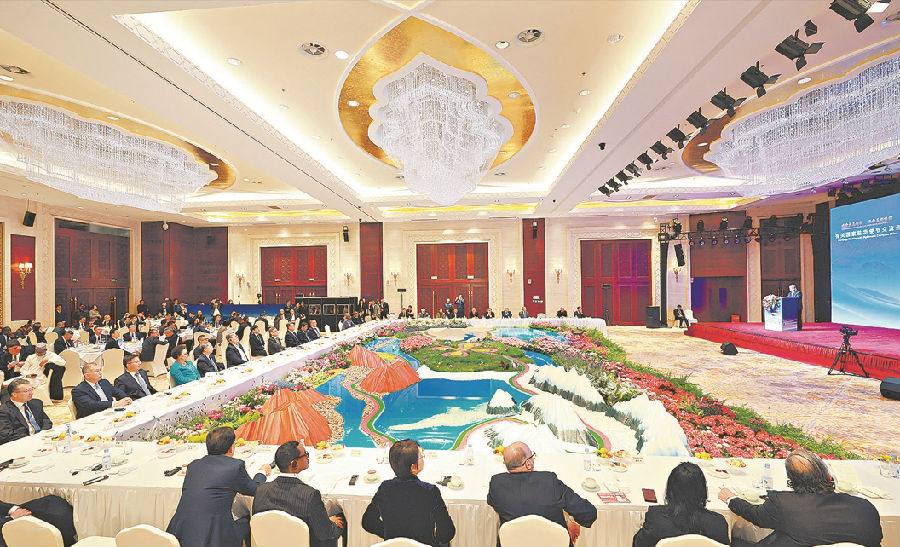 北京新疆大厦木卡姆厅布置一新、高朋满座,来自43个国家的驻华大使、外交官和有关国际组织代表欢聚一堂。会议主桌区域内,“新疆是个好地方”主题设计别致典雅。雪山、湖泊、沙漠、草原、花海等元素交相辉映,围绕在精美的中国结造型周围,描绘出一幅大美新疆的多彩画卷。