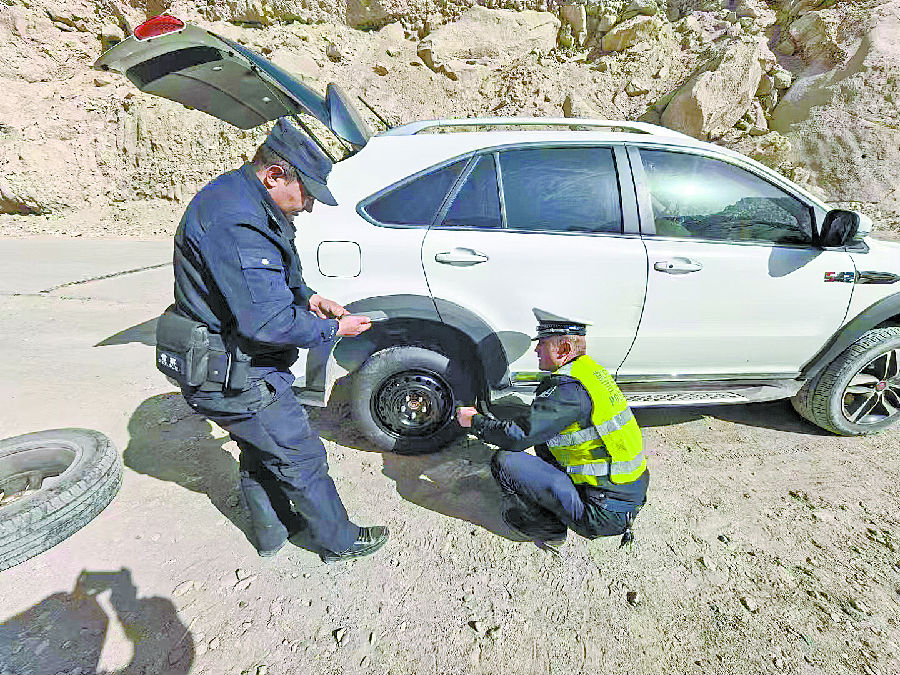 十几分钟后,辅警艾合买提·买合素提、依马木尼亚孜·买买提尼亚孜开着警车赶到。掏出备胎、抡起工具、猫下身子,两人互相配合,几分钟就搞定了。