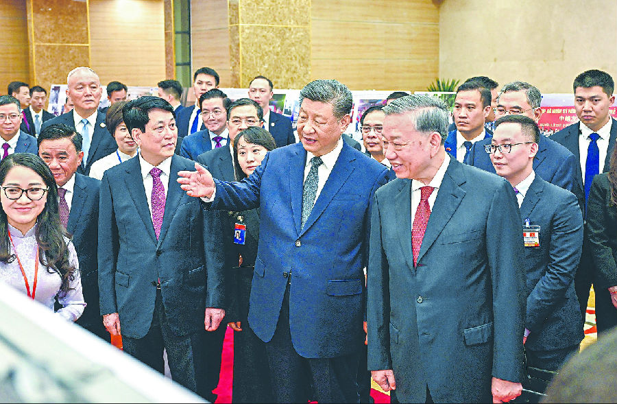4月15日上午,中共中央总书记、国家主席习近平在河内国际会议中心同越共中央总书记苏林、越南国家主席梁强共同会见中越人民大联欢活动代表。这是活动前,习近平在苏林、梁强陪同下,观看中越建交75周年图片展。 新华社记者 殷博古 摄