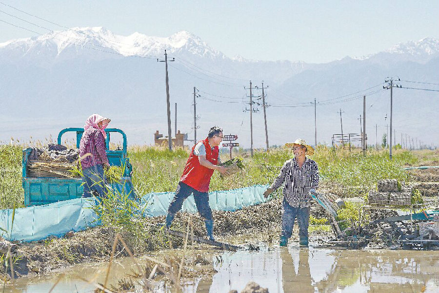 5月13日,“红管家”服务队队员帮助乌苏市四棵树镇农户种植水稻。