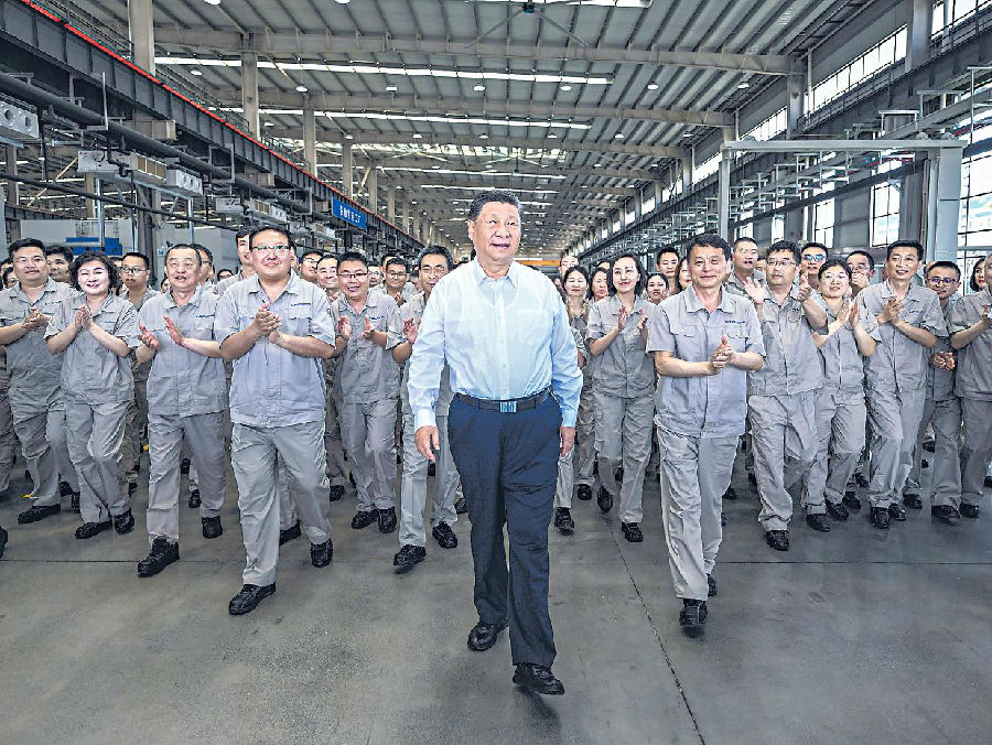 5月19日至20日,中共中央总书记、国家主席、中央军委主席习近平在河南考察。这是19日下午,习近平在洛阳轴承集团股份有限公司智能工厂考察时,同企业职工在一起。 新华社记者 燕雁 摄