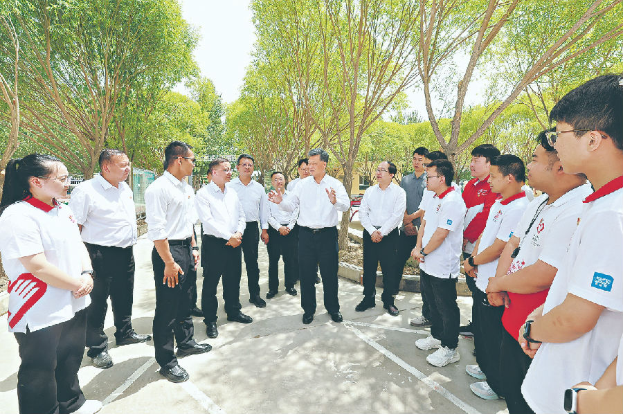 5月27日,自治区党委书记马兴瑞在克孜勒苏柯尔克孜自治州调研。这是马兴瑞来到阿图什市哈拉峻乡谢依特小学,亲切看望戍边支教西部计划志愿者服务队队员,同大家热情交流,关切询问工作生活情况。 石榴云/新疆日报记者 崔志坚摄