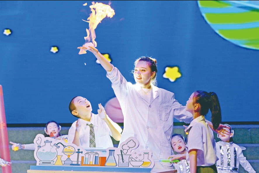 5月28日,乌鲁木齐市沙依巴克区教育系统“筑梦新时代 美好向未来”庆“六一”国际儿童节展演活动在自治区文化馆盛大启幕。本次活动汇聚了乌市沙区各学校的精彩节目,以艺术为桥梁,展现了新时代少年儿童的精神风貌与梦想追求。图为乌鲁木齐市第22小学师生表演科学实验秀《摘星少年》。 石榴云/新疆法治报记者 单坤 摄
