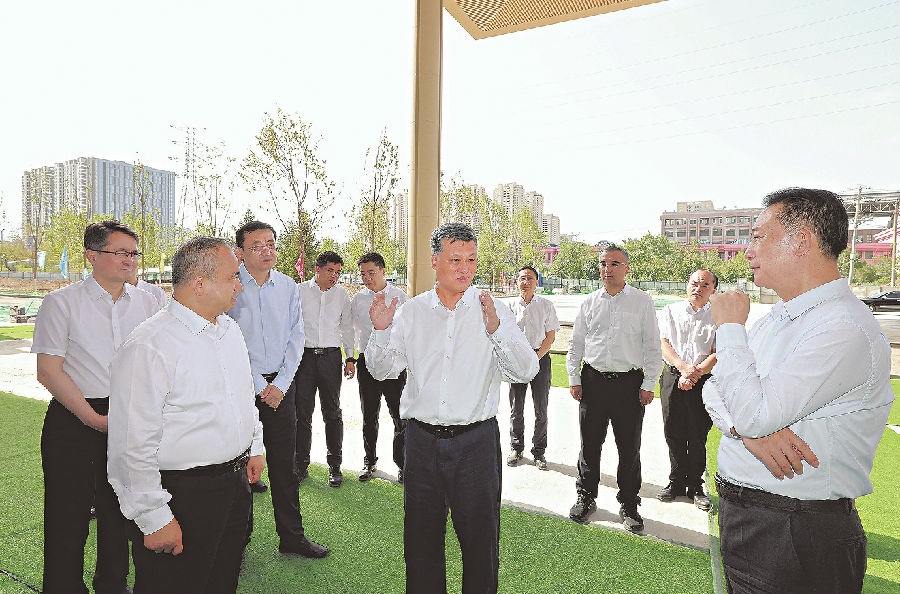 6月15日,自治区党委书记马兴瑞、自治区主席艾尔肯·吐尼亚孜在新疆国际医疗中心调研。这是马兴瑞、艾尔肯·吐尼亚孜来到建设现场,察看整体情况,详细听取一期项目推进和二期项目规划情况介绍。 石榴云/新疆日报记者 崔志坚 摄