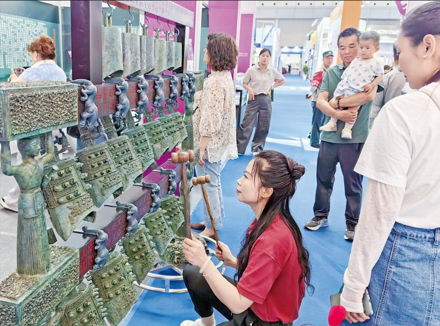 图为当日,在2025(中国)亚欧商品贸易博览会文化和旅游产业链展馆,工作人员现场进行编钟演示。