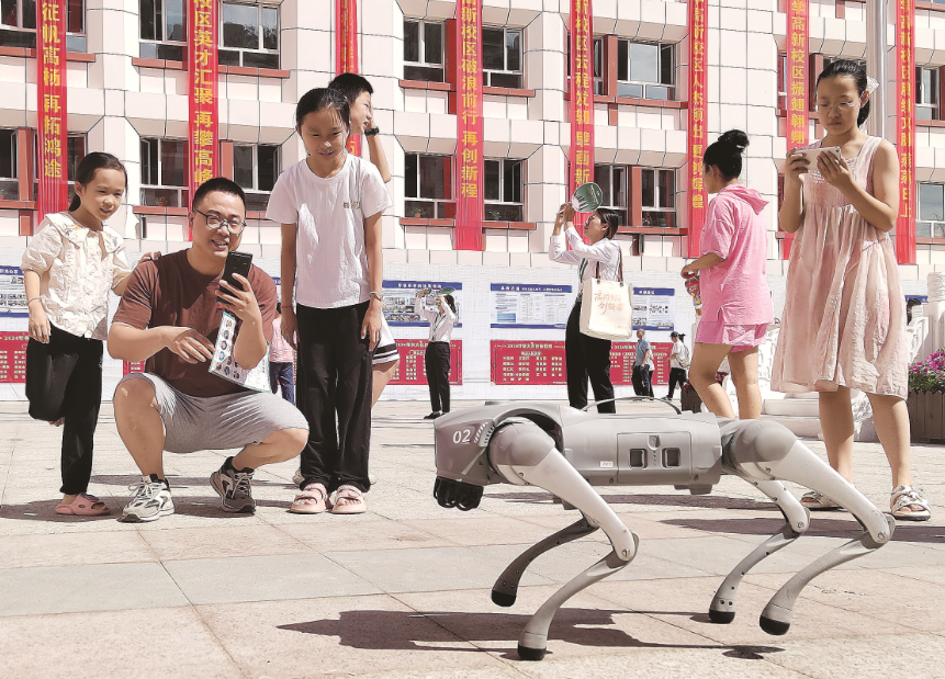 当日,该校举行校园开放日活动,千余名周边居民前来参观、拍摄、咨询,了解招生政策、师资队伍、志愿填报,感受校园文化。图为市民在活动现场与机器狗互动。 石榴云/新疆日报记者 邹懿 摄