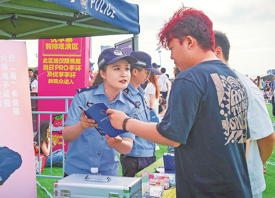 音乐节现场,乌市公安局、乌市消防救援支队等部门工作人员维护秩序、宣讲安全知识,保障演出安全顺利进行。图为7月12日,米东区公安分局民辅警向乐迷宣传反诈知识。