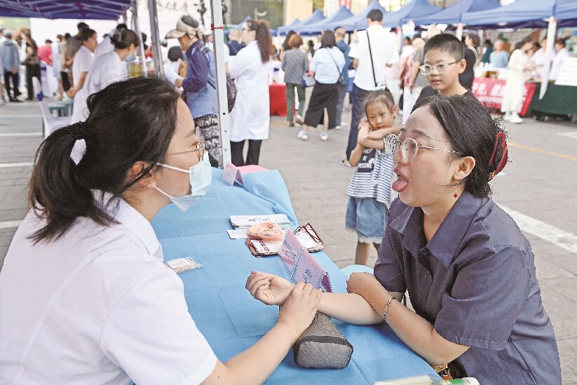 7月22日,由乌鲁木齐市卫生健康委员会、沙依巴克区卫生健康委员会共同主办的 “乌市夜未央·中医惠健康”乌鲁木齐市中医药文化夜市暨沙依巴克区第二届中医药文化宣传推广系列活动启动,共有40家公立中医医院及社区卫生服务中心(站)参与活动,活动将持续到9月底。图为中医为群众看诊。石榴云/新疆法治报记者 单坤 摄