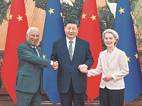 三是践行多边主义,维护国际规则秩序。面对战争与和平、竞争与合作、封闭与开放的重大选择,多边主义、团结合作才是正确答案。中欧要共同维护第二次世界大战结束后建立起来的国际规则和国际秩序,与时俱进推动构建更加公正合理的全球治理体系,携手应对气候变化等全球性挑战,让多边主义的火炬照亮人类前行之路。中欧要支持通过政治手段和平解决国际争端。中方一贯从事情本身的是非曲直出发,主张劝和促谈,倡导标本兼治。中方愿同欧方加强协调,推动今年联合国气候变化贝伦大会取得成功,为应对气候变化和全球绿色转型作出更大贡献。中方也愿同欧方开展人工智能领域政策沟通和务实合作,共同推动平等有序的世界多极化、普惠包容的经济全球化。