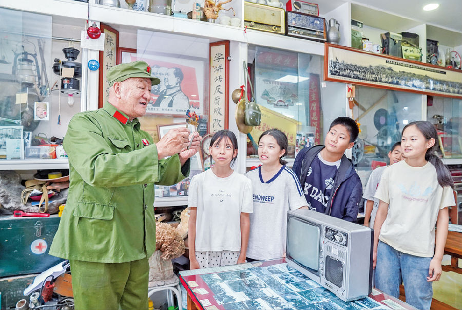 7月30日,在老兵马方兵家中,孩子们聆听马方兵讲述红色故事。连日来,乌苏市新市区街道文德路社区在公益暑托班上开展“传承‘八一’精神 赓续红色血脉”主题教育活动,邀请老兵为学生们讲述红色故事。 李仁锡 摄