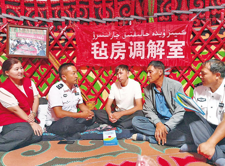 阿勒泰地区还创新推动乡(镇)综治中心功能向边境一线延伸,组织法律顾问、边境警务站等力量组建边境调解队伍;运用 “牧道法庭”“毡房说事点” 等载体,抓牢矛盾预警防范、风险评估、排查化解、定期回访四个关键环节,实现纠纷“就地解”,矛盾 “零上交”。