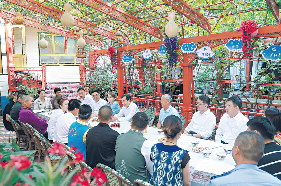 八月五日至六日,自治区党委书记、兵团党委第一书记、第一政委陈小江在伊犁哈萨克自治州和兵团第四师可克达拉市调研。这是八月六日,陈小江来到伊宁市六星街社区,同正在开展“伊犁人的奶茶会”的各族群众亲切交谈。 石榴云\新疆日报记者 崔志坚 摄