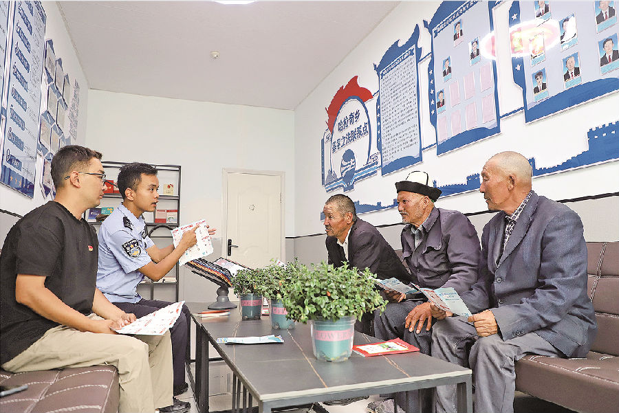 8月15日,在阿合奇县哈拉奇乡基层立法联系点,党员干部、民警围绕防范电信网络诈骗为群众提供法律咨询服务。