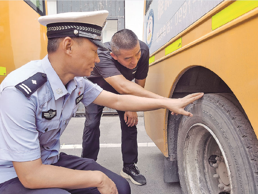 8月12日,乌鲁木齐市公安局交警支队沙依巴克区大队民警检查校车轮胎磨损程度。当日,该大队联合乌市沙区教育局,对辖区校车开展安全“体检”,重点检查校车制动系统、转向系统、轮胎、车灯等关键部件,确保车辆性能良好。石榴云/新疆法治报记者 单坤 摄
