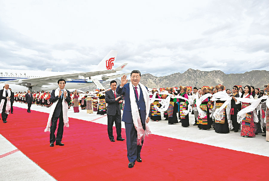 西藏自治区党委书记王君正、自治区人大常委会主任严金海、自治区人民政府主席嘎玛泽登、自治区政协党组书记刘江等在舷梯下迎候。习近平走下舷梯时,王君正敬献哈达,礼仪人员敬献切玛和青稞酒。各族群众代表身着节日盛装,挥动红旗和五彩花束,跳起欢快的民族舞蹈,欢迎总书记的到来,表达对总书记的衷心祝福。