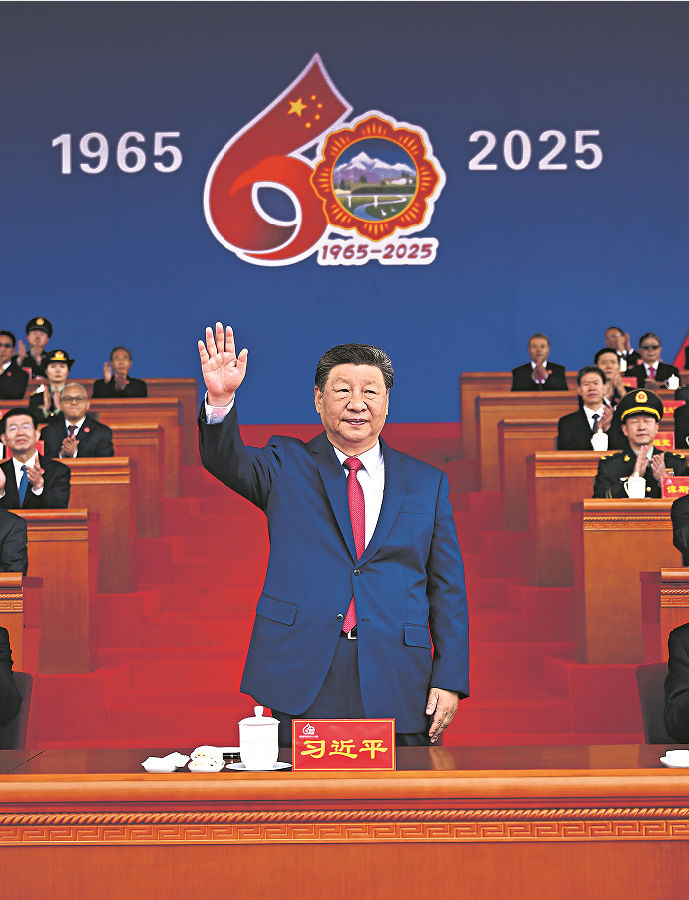 王沪宁发表讲话。他说,1965年9月,在党中央亲切关怀和党的民族政策光辉照耀下,西藏自治区宣告成立。这是西藏发展史上具有划时代意义的大事,巩固了西藏和平解放和民主改革的伟大成果,实现了西藏社会制度的历史性跨越。60年来,西藏经济社会全面发展,民族区域自治制度成功实践,民族团结日益巩固,各族人民生活蒸蒸日上,充分展现了中国共产党领导的坚强力量,充分展现了我国社会主义制度的显著政治优势。