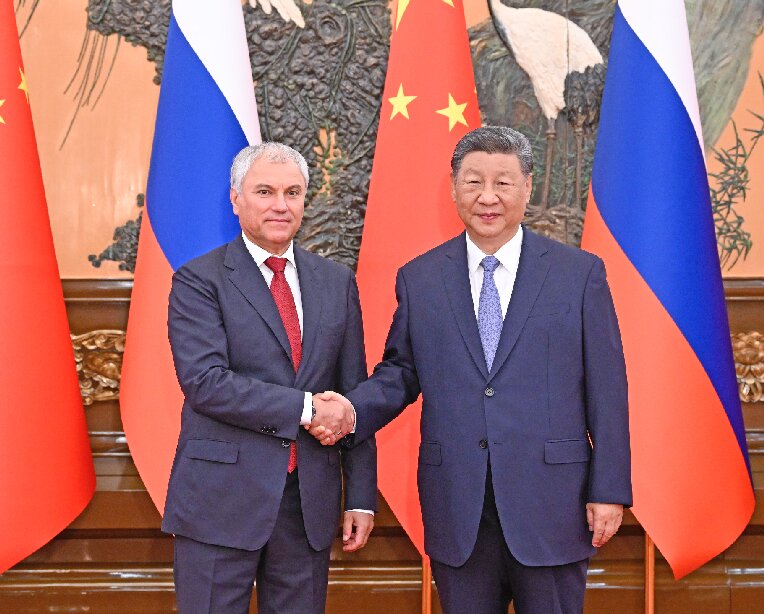 沃洛金转达普京总统对习近平主席的亲切问候和良好祝愿。沃洛金说,在两国元首战略引领下,俄中关系深入发展,卓有成效。俄国家杜马致力于落实两国元首重要共识,加强俄中立法机构交流合作,全力以赴推动两国关系取得更多成果。80年前,苏联和中国人民为战胜法西斯作出重大贡献。俄方愿同中方共同庆祝这一来之不易的胜利,缅怀先烈,携手开创美好未来。