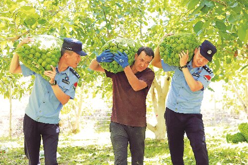 当下正值核桃采收季,8月27日,新疆出入境边防检查总站阿克苏边境管理支队吐木秀克边境派出所民警深入辖区果园,帮助果农采摘、搬运核桃,同时普及防溺水、禁毒、反诈等知识,真正做到宣传、助农服务都到位。