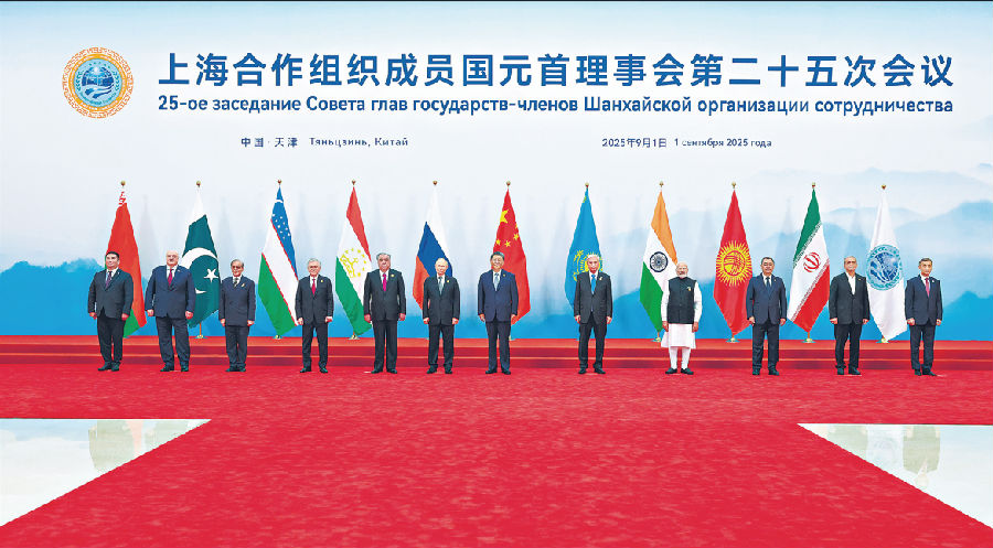 9月1日上午,上海合作组织成员国元首理事会第二十五次会议在天津梅江会展中心举行。中国国家主席习近平主持会议并发表题为《牢记初心使命 开创美好未来》的重要讲话。这是习近平同出席会议的上海合作组织成员国领导人、常设机构负责人集体合影。 新华社记者 黄敬文 摄