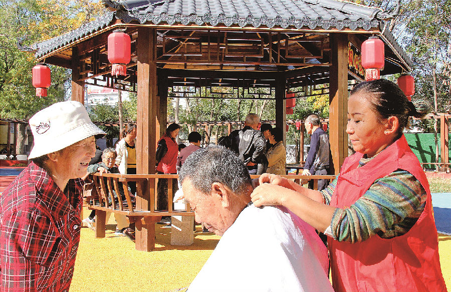9月16日,裕民县哈拉布拉镇文化街社区志愿者义务为社区居民理发。