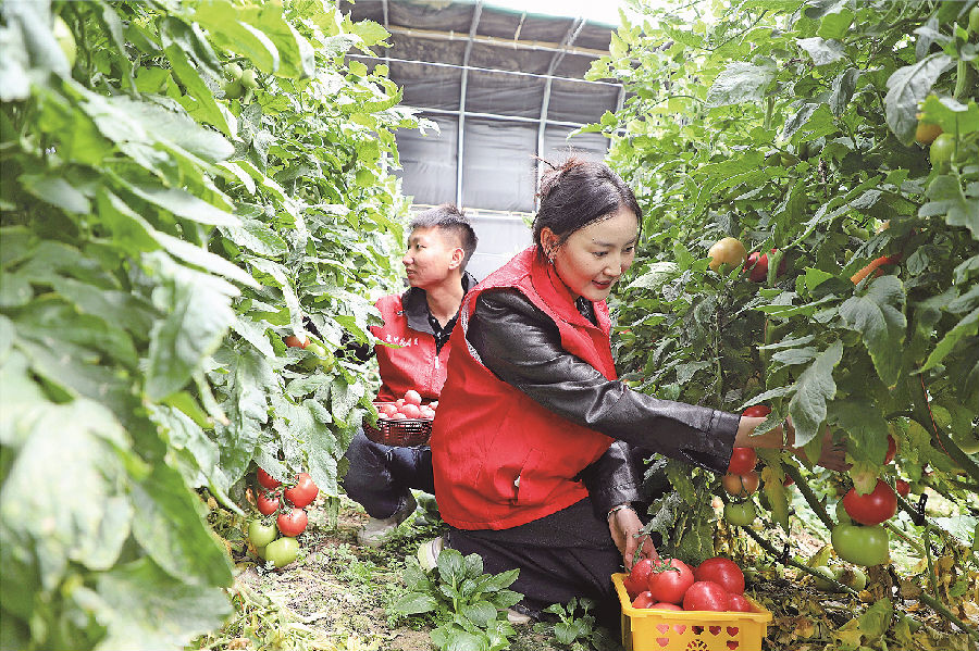 9月16日,在阿合奇县农(牧)光互补温室果蔬种植大棚,党员干部帮助农户采摘西红柿。连日来,阿合奇县组织党员干部深入田间地头、种植基地,开展“办实事 助农忙”服务活动,帮助农户采摘西红柿、青椒、黄桃等蔬果,助力农户增收致富。 古丽加马力·艾萨 摄