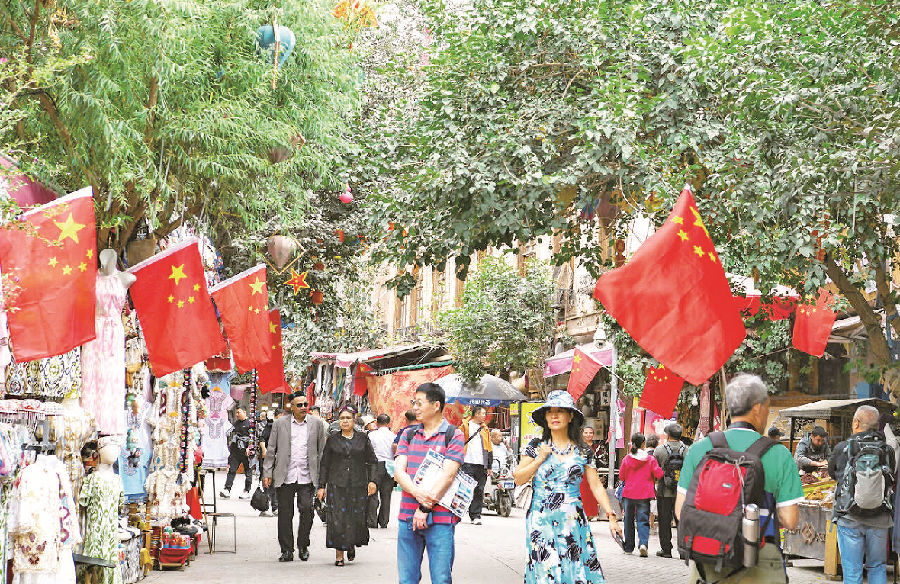 9月18日,游客在喀什古城景区游玩。从城市的繁华地段到景区景点,喀什市用满满的 “中国红” 和喜庆元素,诉说对自治区成立 70 周年的美好祝愿。 石榴云/新疆日报记者 约提克尔·尼加提 摄