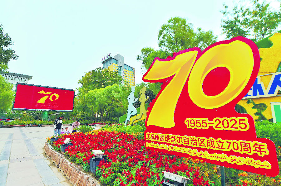 库尔勒市人民广场设置的“庆祝新疆维吾尔自治区成立70周年”宣传牌(9 月19日摄)。连日来,库尔勒市大街小巷洋溢着喜庆氛围,以最美姿态向自治区成立70周年献礼。 石榴云/新疆日报记者 王立华 摄