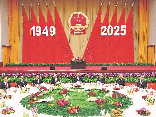 人民大会堂宴会厅华灯璀璨,洋溢着喜庆热烈的节日氛围。主席台上方高悬着庄严的国徽,“1949—2025”大字年号在鲜艳红旗映衬下格外醒目。