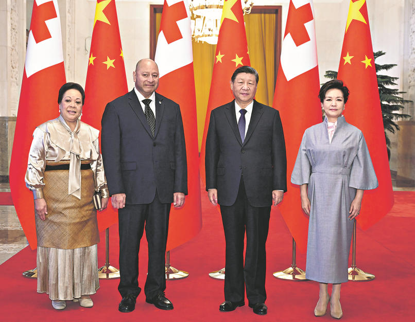 11月25日上午,国家主席习近平在北京人民大会堂会见来华进行国事访问的汤加国王图普六世。这是习近平和夫人彭丽媛同图普六世和王后娜娜茜帕乌合影。 新华社记者 燕雁 摄